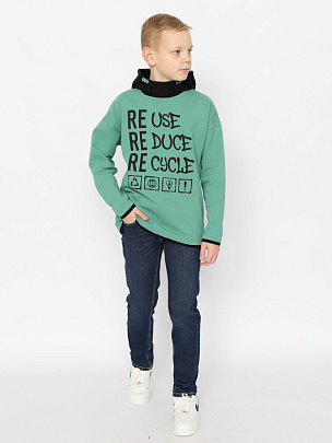 Толстовка с длинными рукавами, притачными планками по низу изделия и рукава. Капюшон с подкладкой и декоративным шнурком. Перед декорирован принтом "Перерабатывай и используй повторно".