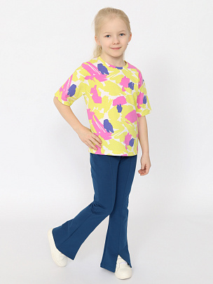 Трикотажная футболка оверсайз для девочки, выполненная из мягкого набивного трикотажа. Свободный силуэт с заниженной линией плеча не сковывает движения. Модель дополнена круглым вырезом горловины и короткими рукавами.