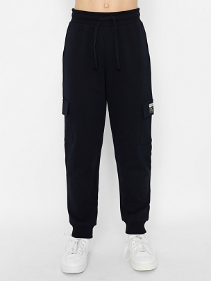 Брюки для мальчика с накладными карманами с клапаном. Нижние срезы брюк оформлены притачными манжетами из полотна с эластаном. Пояс притачной, с резинкой и функциональным шнуром. На карман настрочена декоративная жаккардовая этикетка.
